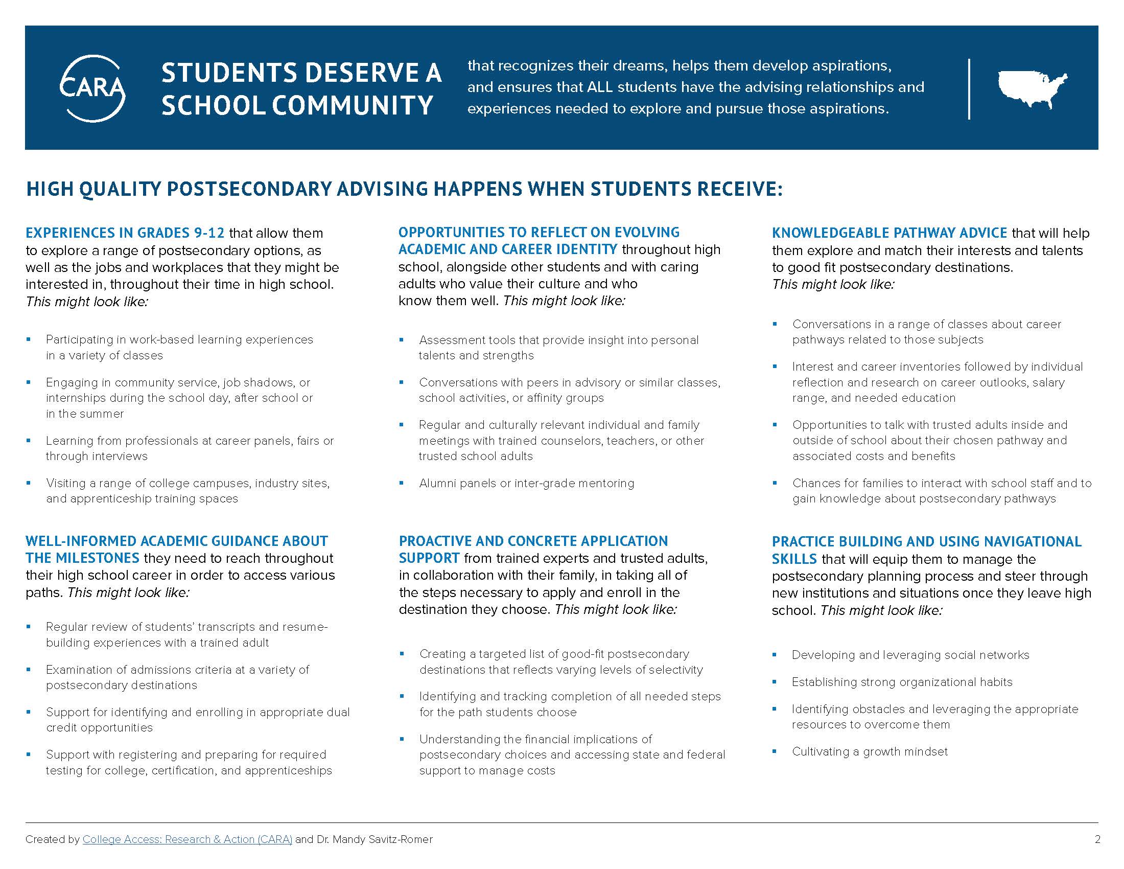To meet this moment, it is critical that our field unify around a single, shared understanding of what comprises high quality postsecondary advising, and how it can be implemented in schools.